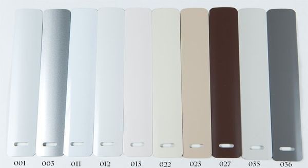 Värivaihtoehdot. Saatavat säleleveydet ovat 25, 35 ja 50 mm.